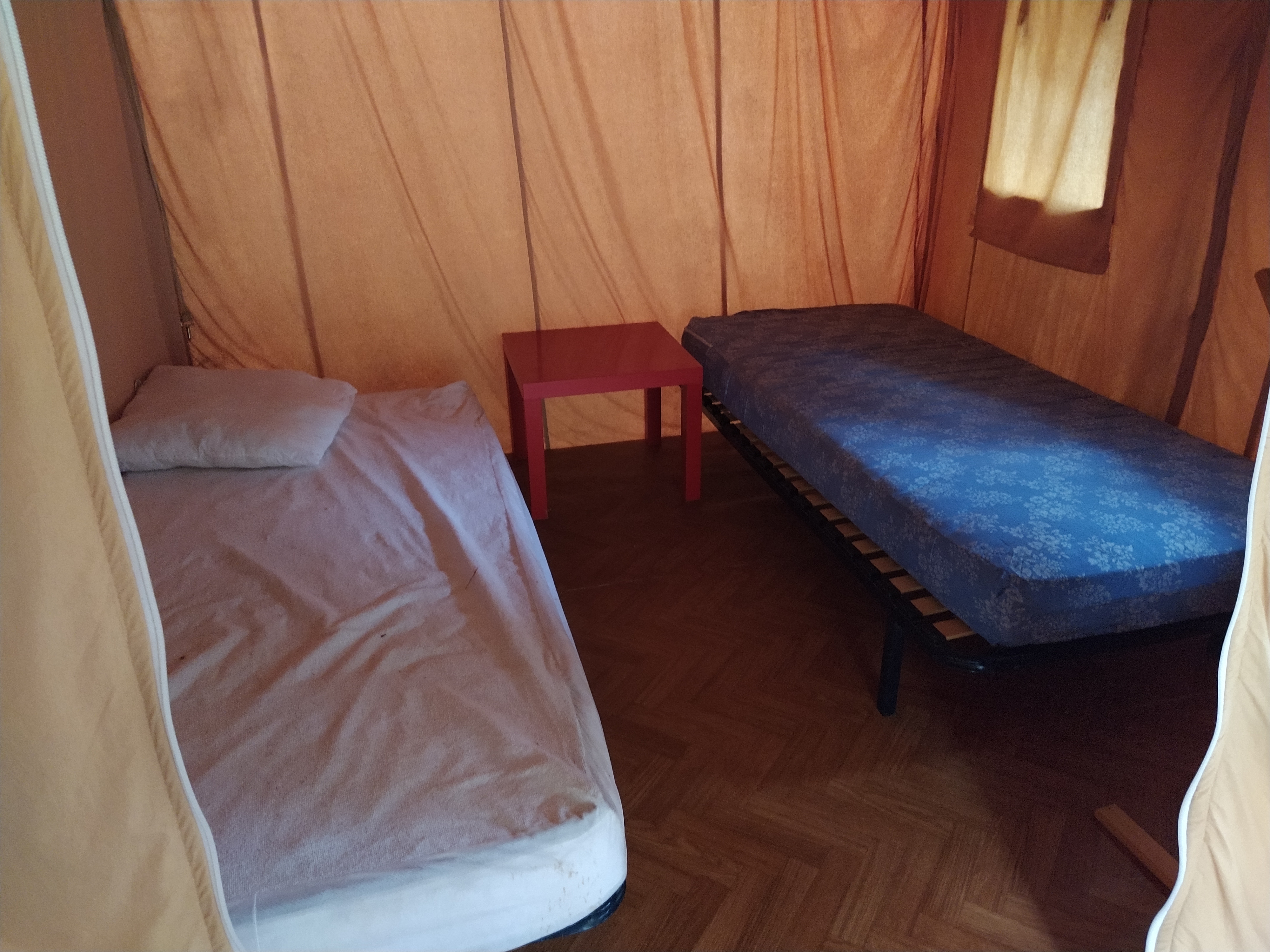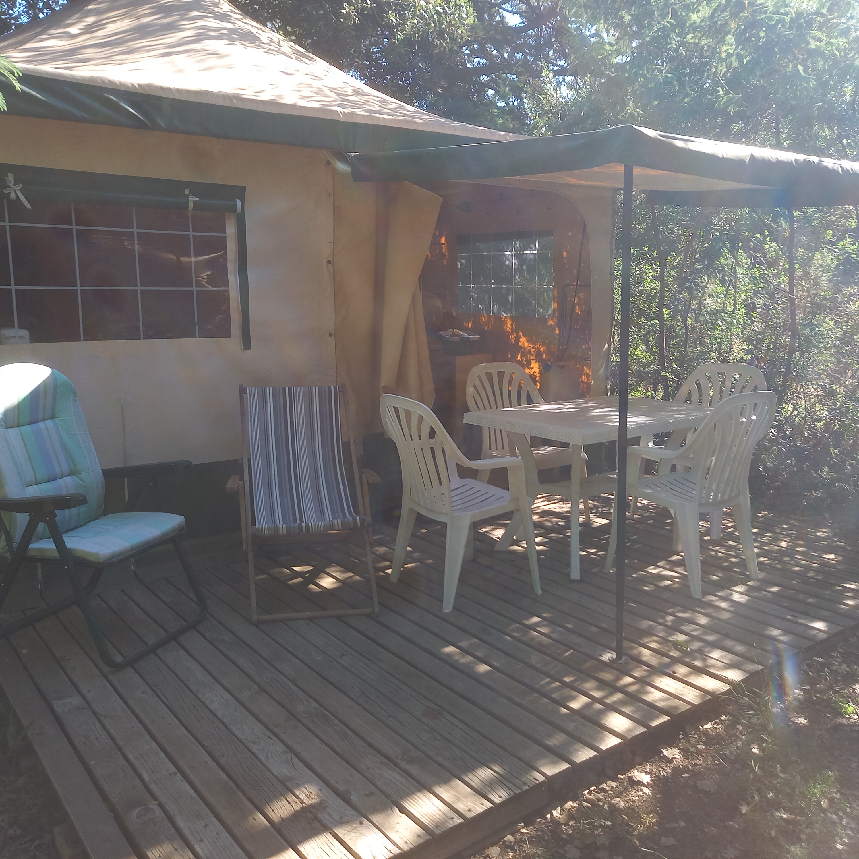 Elles sont composées de 2 chambres, d’un espace à vivre avec coin cuisine (sans eau courante) et d’une grande terrasse. Vous n'avez pas de sanitaire privatif. Ceux du camping sont à votre disposition.