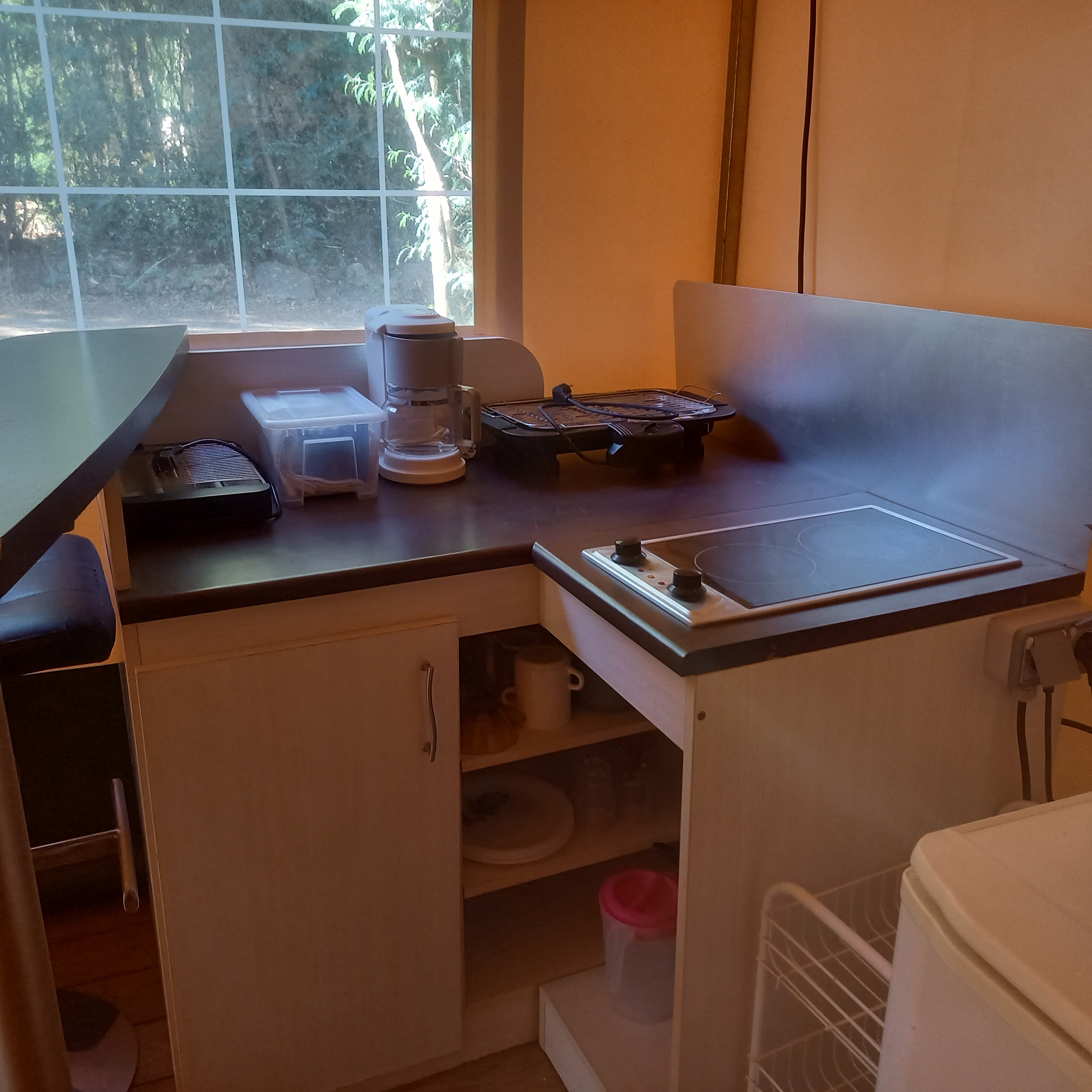 Description : Terrasse semi-couverte, salon de jardin. Coin cuisine équipé : camping gaz, micro-onde, cafetière, refrigérateur avec freezer, grille pain, vaisselle et ustensiles de cuisine. 2 chambres : 1 avec 1 lit 140x190 et 1 avec 2 lits 90x190 dont 1 superposé. Toilettes et douche aux sanitaires du camping.